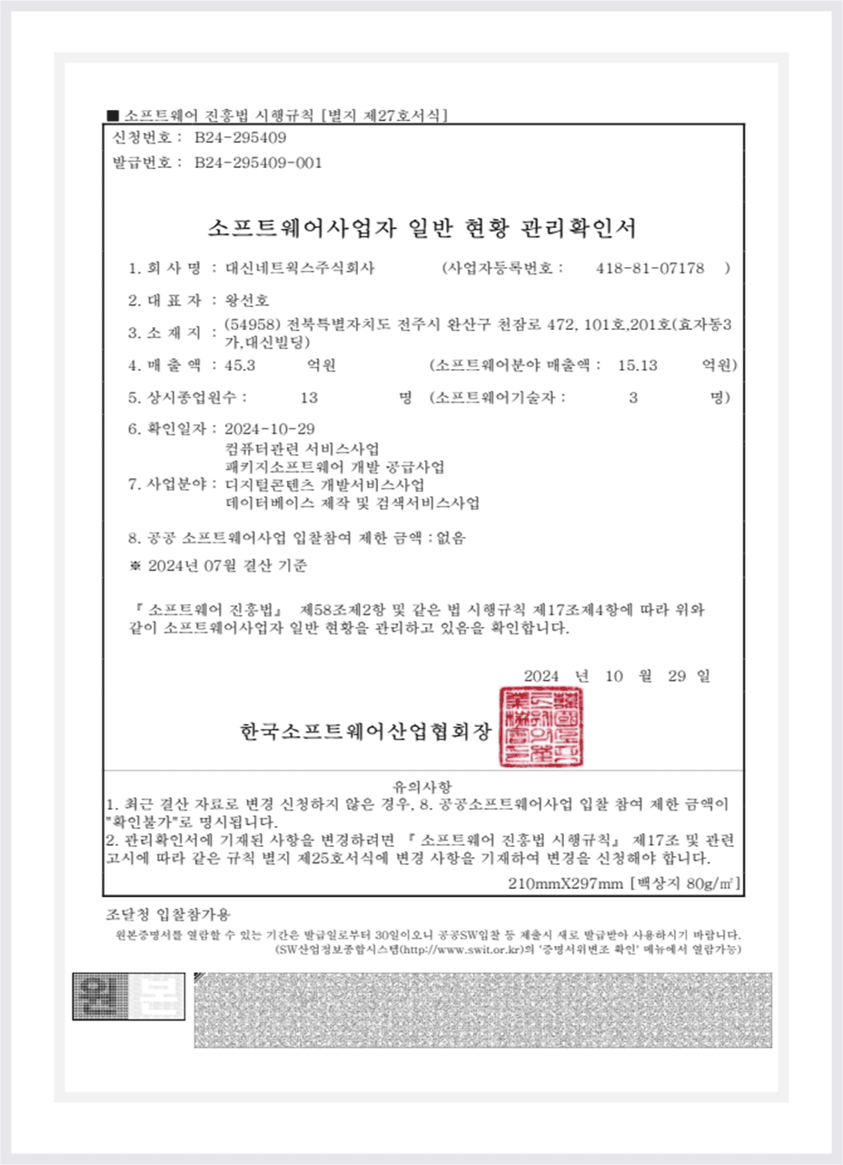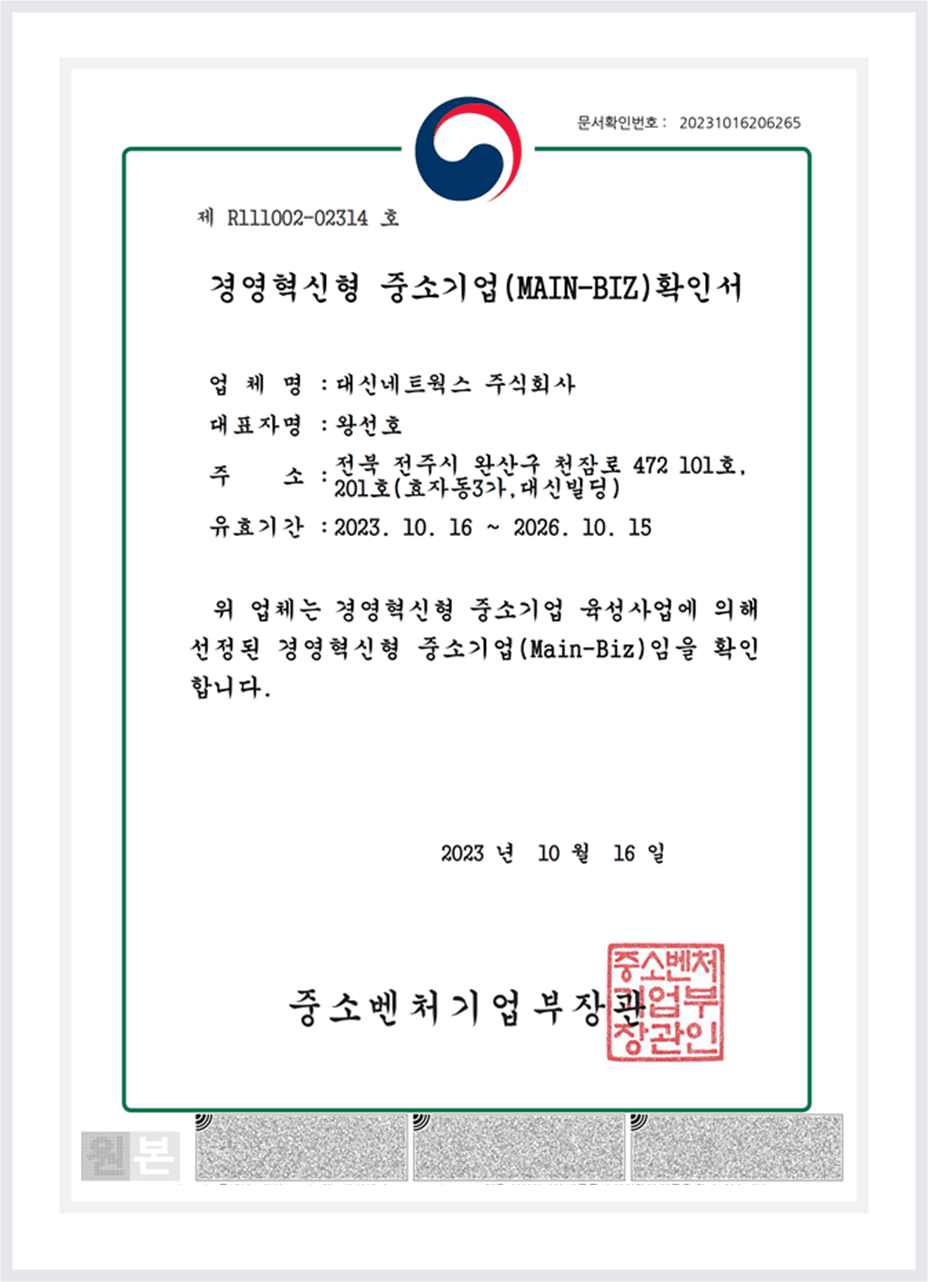 대신네트웍스는 기업의 안정성과 성장 잠재력을 공인받은 객관적인 인증 지표들을 통해 체계적인 경영 시스템을 입증합니다. 이는 단순한 형식이 아닌, 끊임없는 R&D 투자의 결실이자 미래 혁신에 대한 의지입니다.