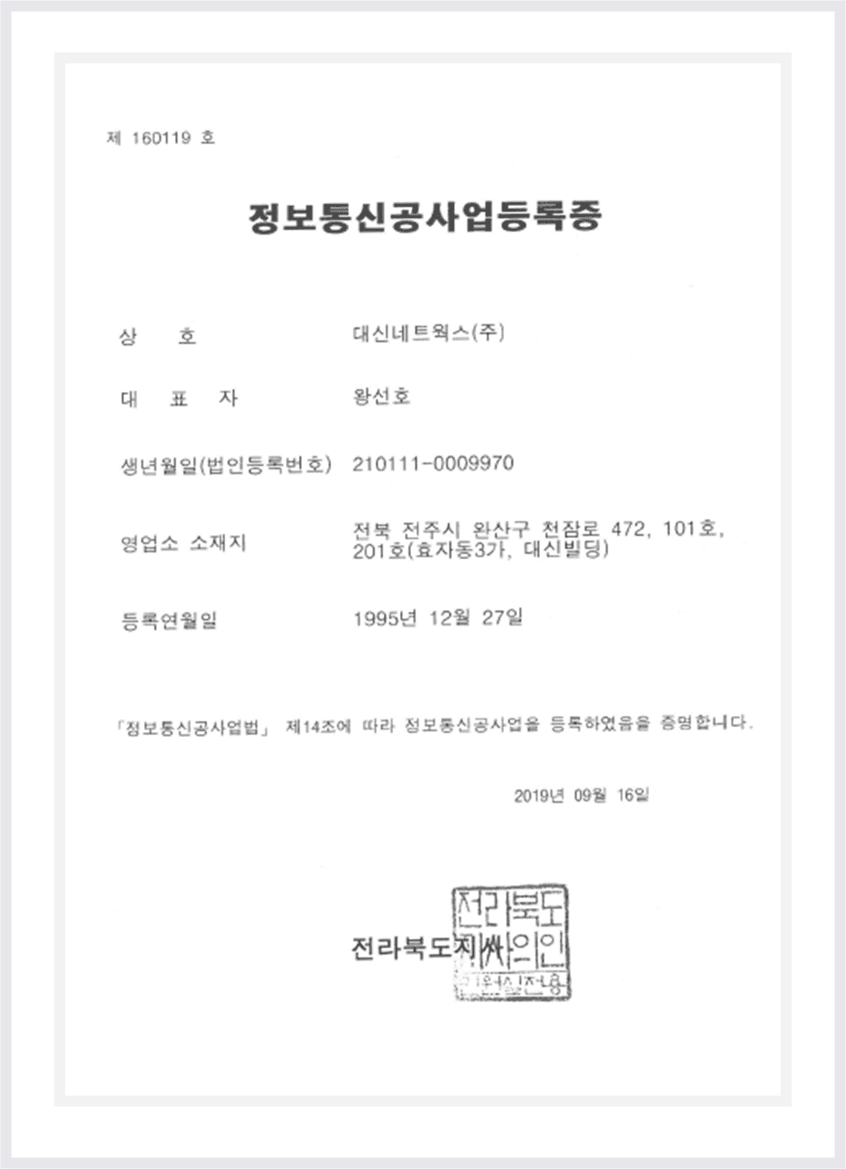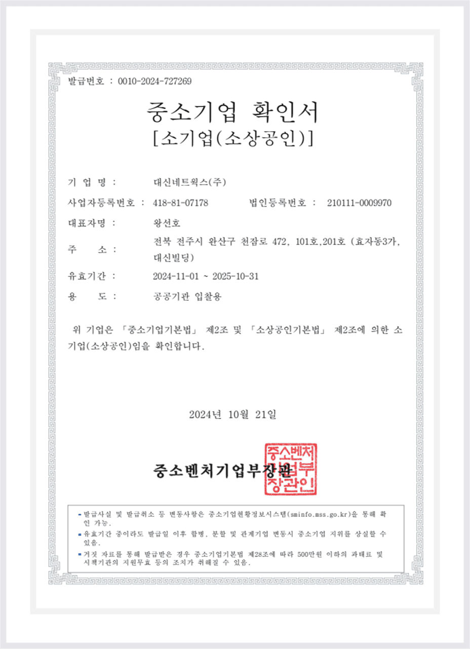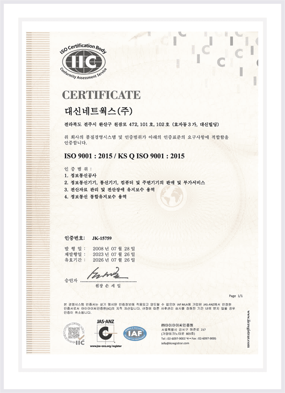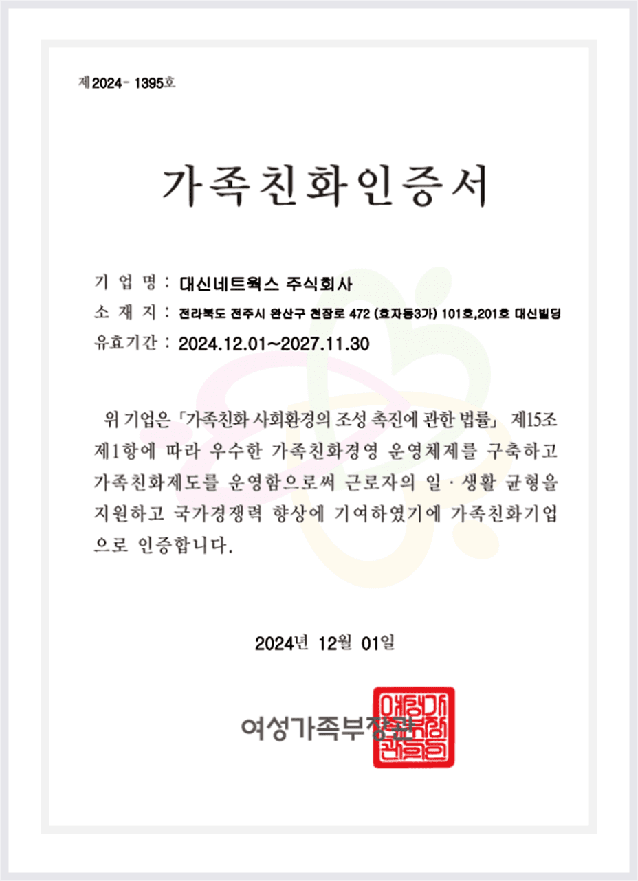 1991년 설립 이래, 대신네트웍스는 가족 친화 인증을 받은 경영 철학을 바탕으로 안정적인 성장을 지속해왔습니다. 품질경영시스템 인증과 다수의 지적재산권으로 공인된 기술력은 고객에게 최상의 품질과 서비스 안정성을 제공하겠다는 30년의 변함없는 약속입니다.
