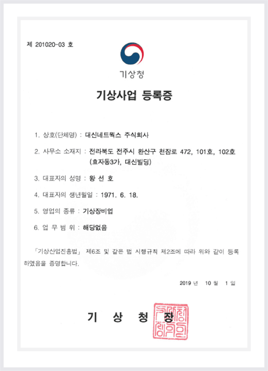 최첨단 정보통신 인프라의 설계 및 구축 역량을 바탕으로, 사회 전반의 디지털 안정성을 확보합니다. 이를 통해 자연재난을 예측하고 대응하는 선진 안전망을 구현하여, 국민의 삶과 자산이 보호되는 지속 가능한 사회 건설에 기여하는 것이 대신네트웍스의 사명입니다.