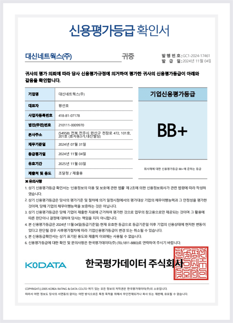 고객 여러분의 변함없는 신뢰와 따뜻한 조언은 대신네트웍스의 가장 큰 동력입니다. 고객의 목소리에 귀 기울이며, 최고 품질의 서비스와 책임감 있는 자세로 함께 성장하는 미래를 만들어가겠습니다.